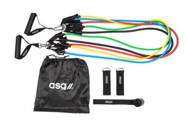 ASG treningstrikk sett med 11 deler. Settet inneholder ankelstropp, håndtak, bæreveske, dørankere og 5 motstandsbånd med forskjellig motstand. Med settet kan du lage og kombinere over 30 forskjellige motstandsnivåer totalt, ved å feste forskjellige kombinasjoner av de 5 medfølgende stroppene til håndtakene. Motstandsnivå: Opp til 45 kg. Med dette settet kan du effektivt bygge muskler og styrke. Settet kan brukes til å gjøre en lang rekke forskjellige øvelser på vanligvis kan bruke både en treningstrikk og en trinse til. Perfekt for hjemmetrening.