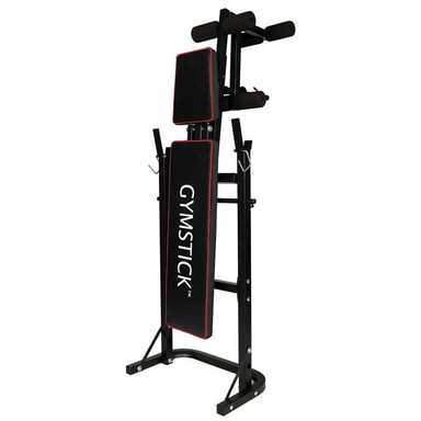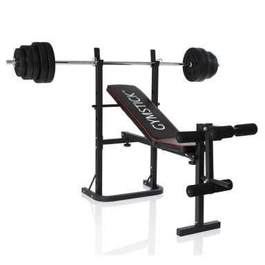 Treningsbenk fra Gymstick med en skivestang på 7,3 kg og vektplater på til sammen 32,5 kg. Benken tilbyr mulighet til benkpress, side benkpress og fremside- og bakside lår. Ryggstøtten er justerbar i fire forskjellige høyder. Etter trening kan benken enkelt slås sammen og oppbevare smart. Vektlås inngår. Maksimal belastning 80 kg. Maksimal bruksvekt 100 kg. Garanti 1 år.
