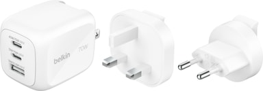 Belkin 70 W Tri-port vegglader gir rask lading for ulike enheter, med global UK/EU/US-kontaktkompatibilitet, pålitelig drift og flere sikkerhetsfunksjoner som sørger for trygg og rask strøm på reisen.Les mer om produktet