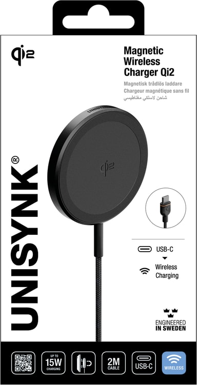 Unisynk Qi2 15W trådløs lader holder din MagSafe-telefon på plass, mens det blir ladet opp av 15W ytelse slik at du alltid har et oppladet batteri. Den er Qi-kompatibel og kommer med en 1,8m kabel - lad på en trygg og hurtig måte.Les mer om produktet