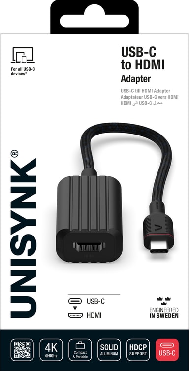 Unysink USB-C til HDMI adapter 10377 lar deg koble den bærbare datamaskinen eller andre enheter til en ekstern skjerm med opptil 4K Ultra HD-oppløsning ved 60 Hz, innkapslet i en slitesterk aluminiumspakke med en forsterket kabel.Les mer om produktet