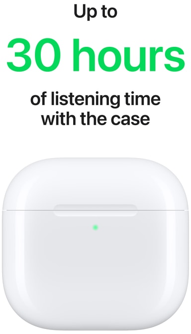 Opptil 30 timerslyttetid med etuiet.Se juridiske ansvarsfraskrivelserOpptil 5 timerslyttetid på én lading.Se juridiske ansvarsfraskrivelserOpptil 4 timerslyttetid med Aktiv støyreduksjon på én lading.Se juridiske ansvarsfraskrivelser
