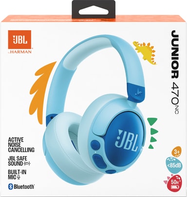 JBL Junior 470NC trådløse over-ear hodetelefoner har barnevennlig design med justerbar hodebøyle, JBL Safe Sound og ANC. De har 50 timers batteritid og en innebygd mikrofon for samtaler. Foreldre kan styre volum og bruk via JBL-appen.
