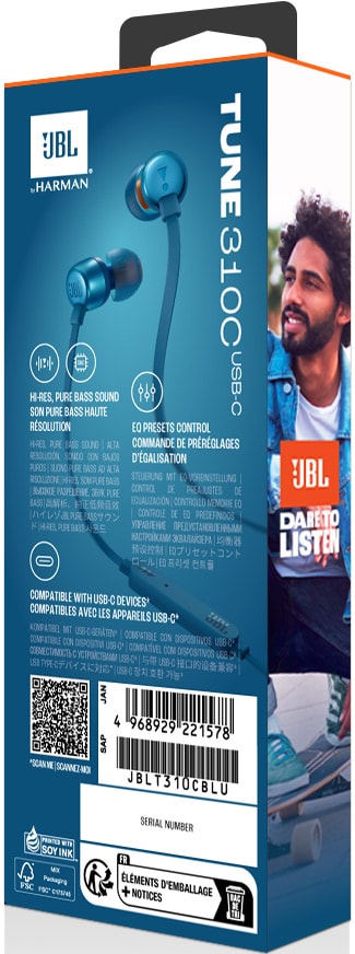 Dykk dypt inn i en verden full av overlegen lydkvalitet med JBL Tune 310 USB-C øreplugger. Lytt til ditt favorittinnhold i forbedret kvalitet takket være JBL Pure Bass og lyd i høy oppløsning mens du er koblet til enhver USB-C-kompatibel enhet. Bruk fjernkontrollen med innebygd mikrofon og tre knapper til å enkelt administrere din musikk og anrop, eller bruk ett av de forhåndsinnstilte equalizer-oppsettene for lyd som matcher ditt stiluttrykk.