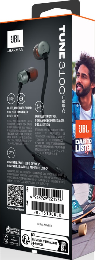 Dykk dypt inn i en verden full av overlegen lydkvalitet med JBL Tune 310 USB-C øreplugger. Lytt til ditt favorittinnhold i forbedret kvalitet takket være JBL Pure Bass og lyd i høy oppløsning mens du er koblet til enhver USB-C-kompatibel enhet. Bruk fjernkontrollen med innebygd mikrofon og tre knapper til å enkelt administrere din musikk og anrop, eller bruk ett av de forhåndsinnstilte equalizer-oppsettene for lyd som matcher ditt stiluttrykk.