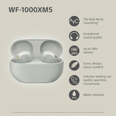 • Sony WF-1000XM5 helt trådløse in-ear hodetelefoner (sølv)
