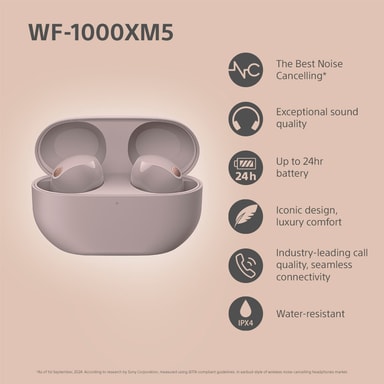 Sony WF1000XM5P helt trådløse in-ear hodetelefoner gir lyd av høy kvalitet uten kabler og har aktiv støyreduksjon. De bruker avansert teknologi som Dynamic Driver X for fyldig lyd og støtter Hi-Resolution Audio Wireless og DSEE Extreme for forbedret musikkvalitet. De har 24 timers total batteritid, rask og trådløs lading og klar stemme under samtaler, de kan også integreres med stemmeassistent og leveres med et komfortabelt ergonomisk design og støyisolerende tupper.