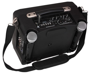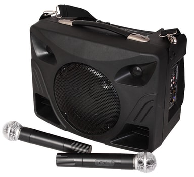 Perfekt til fitness, street-performance og presentasjoner Innebyggd ladbart batteri Lad i bilen via kabel til sigarettenderen Inkl. 2 trådløse mikrofoner Avspill fra USB / MP3 / SD-kort / Bluetooth Inkl. fjernkontroll Skulderrem ...Les mer om produktet