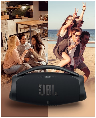 Strøm musikk hele dagen og ta med deg JBL Boombox 3 fra rom til rom, til stranden eller på fest. Og med 24 timers batteritid kan du spille musikk til solen går ned, og kommer opp igjen, før du trenger å lade den.