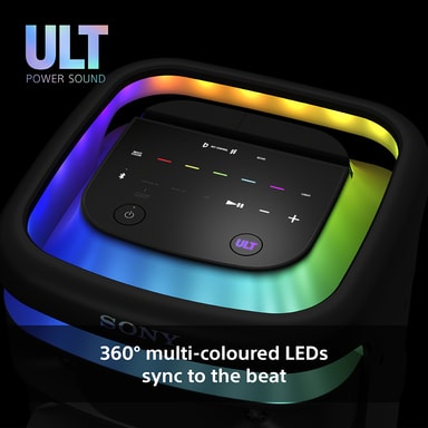 Flerfarget LED-belysning i 360 grader synkroniseres automatisk med rytmen for å skape god stemning. Du kan kontrollere og tilpasse den ved hjelp av berøringspanelet på toppen av Bluetooth-høyttaleren eller via Sony Music Center-appen