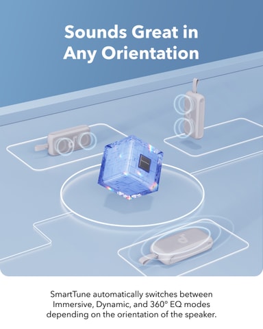 SmartTune™-teknologi – Lyd som tilpasser seg deg Motion 300 er utstyrt med soundcores eksklusive SmartTune™-teknologi som automatisk oppdager høyttalerens posisjon og justerer lydprofilen deretter – enten den står, ligger eller henger på ryggsekken din. Immersive-modus: Gir direkte lyd mot deg for en intens soloopplevelse. Dynamic-modus: Perfekt for utendørseventyr – gir mer klarhet og volum når du går eller sykler.
