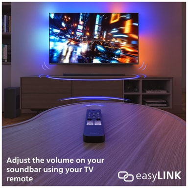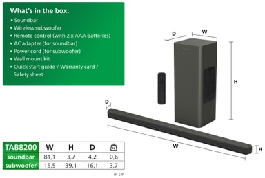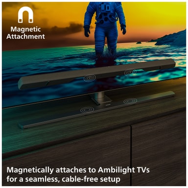 Med sin ultra-slanke profil passer Philips TAB8200 sømløst inn i ethvert hjemmeunderholdningsoppsett. Det kompakte designet gjør det enkelt å plassere den, enten veggmontert eller diskret under TV-en, og bevarer et rent og moderne utseende.