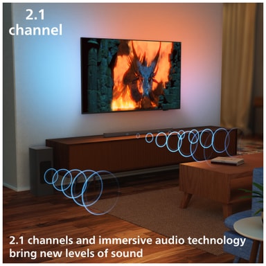 Philips TAB8200 2.1ch lydplanke leverer kinolyd med Dolby Atmos og en trådløs subwoofer, med ultratynt design, HDMI eArc, Bluetooth 5.4 og enkel Google Home-kompatibilitet for sømløs lydkontroll.Les mer om produktet