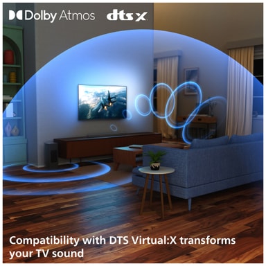 Opplev fremtidens lyd med Dolby Atmos og DTS Virtual:X-teknologi. Disse avanserte lydformatene skaper et flerdimensjonalt lydmiljø som omslutter deg i ditt favorittinnhold, og gir dybde og klarhet til hver tone og lydeffekt.