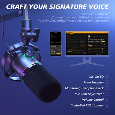 Denne mikrofonen bruker MAONO Link-programvaren for å låse opp avansert lydbehandling. Denne programvaren lar brukere justere Equalizer, sette en Compressor for volumkonsistens og konfigurere en Limiter for å forhindre klipping, samt tilpasse RGB-belysningseffektene.