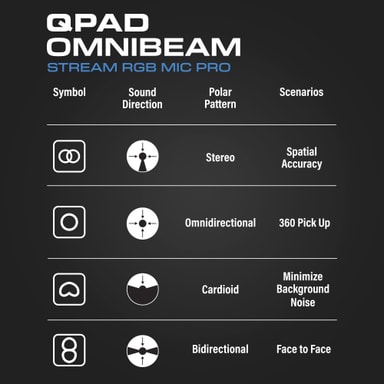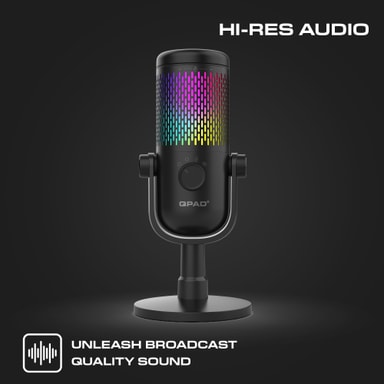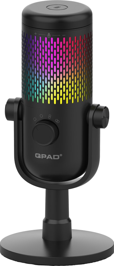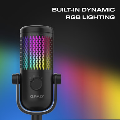 Få en bedre lydopplevelse med QPAD Omnibeam Stream Pro mikrofon med støtte for Hi-Res-lyd, fire lydopptaksmønstre, dynamisk RGB-belysning og en tap-to-mute-funksjon.Les mer om produktet