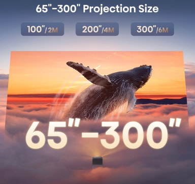 Denne projektoren tilpasser seg alle skjermstørrelser fra 65" til 300", slik at du kan projisere på en vegg i stuen eller en gigantisk skjerm i hagen.