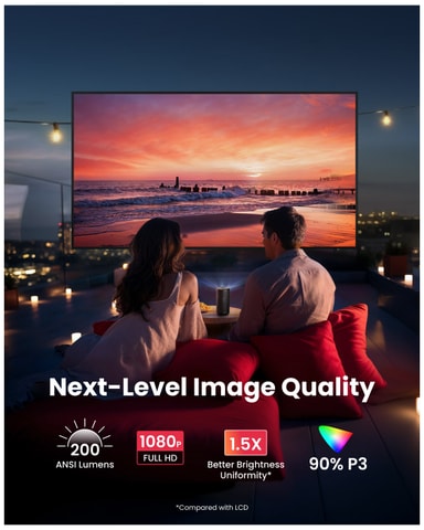 Samle venner og familie og se film på storskjerm med Nebula Capsule 3 projektor. Med Full HD-oppløsning og en lysstyrke på 200 ANSI lumen gir den klare og levende bilder som passer i ulike omgivelser. Autofokus og keystonekorrigering sikrer enkel bruk, og du kan nyte opptil 2,5 timers batteritid for filmvisning eller 8 timers batteritid for musikklytting.