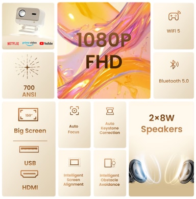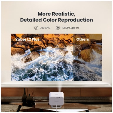 Få en kinoopplevelse hjemme med Yaber L2 Plus projektor. Se favorittfilmene og seriene dine i Full HD-kvalitet og la deg omslutte av den fyldige og detaljerte lyden fra de innebygde JBL-høyttalerne. Det er enkelt å finne den perfekte plasseringen for projektoren takket være Auto Keystone, Focus og roterbart stativ.