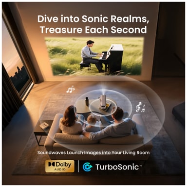 Denne projektoren kommer med innebygd 8W høyttaler med Turbo Sonic-teknologi som sikrer presis lyd med lav forvrengning.