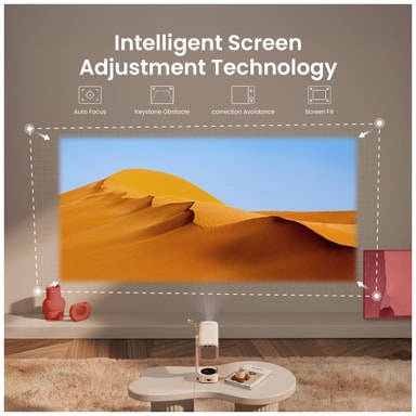 Takket være denne funksjonen får du total fleksibilitet når du skal plassere projektoren. Den automatiske vertikale og horisontale justeringen sikrer at projeksjonene alltid vises optimalt. Dette forsterkes ytterligere ved bruk av Intelligent Obstacle Avoidance og Intelligent Screen Alignment-teknologiene.