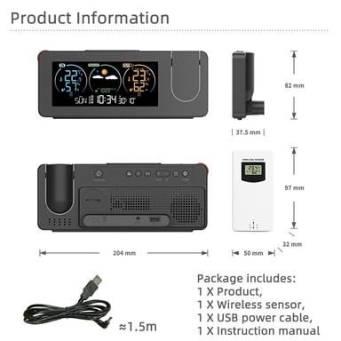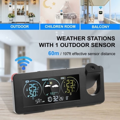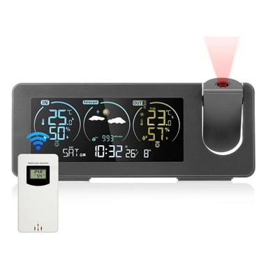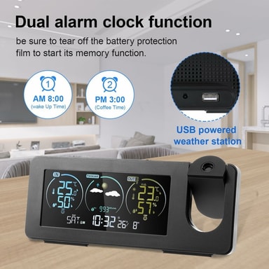 ZX3538 Projeksjonsklokke Kalender Værstasjon Digital alarm med temperatur/fuktighetssensor【Multifunksjonell værstasjon】 Har tids- og temperaturprojeksjon for enkel nattvisning, innendørs/utendørs temperatur og fuktighetsovervåking med 1 utendørs sensLes mer om produktet