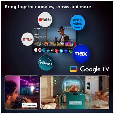 Finner du ikke fjernkontrollen? Bruk bare stemmen din, siden denne TV-en kommer med innebygd Google Assistant. Finn all underholdning og se filmer, serier på strømmetjenester, bruk den til å søke etter anbefalinger, samt kontrollere andre smarte hjemmeenheter. Også kompatibel med Amazon Alexa.