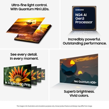 Opplev usett intensitet med superfokusert lys og episk sort med Samsungs ultrafine Quantum Mini LED-er for strålende bildepresisjon. Denne innovative, banebrytende teknologien samarbeider med den kraftige AI-prosessoren for å levere den skarpeste 4K-visningen på skjermen til nå.