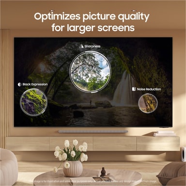 Samsungs kraftige NQ4 AI Gen3 Processor bruker 128 AI-nevrale nettverk til å oppskalere innhold til 4K for detaljer på høyt nivå, raffinerte farger og kontrast til omgivelsene. Supersize Picture Enhancer bruker AI til ytterligere å redusere støy, forbedre skarphet og levere imponerende svartuttrykk for større skjermer. Så du ikke går glipp av noe action, gjør AI Motion Enhancer Pro tempofylte scener jevnere og skarpere slik at du kan se dem tydeligere.
