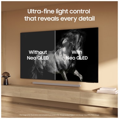 Opplev uovertruffen intensitet med superfokuserte lys og episke sortnivåer med Samsungs ultrafine Quantum Mini LED-er for briljant bildenøyaktighet. Denne innovative, banebrytende teknologien samarbeider med den kraftige AI-prosessoren for å levere den skarpeste 4K-visningen på skjermen hittil.